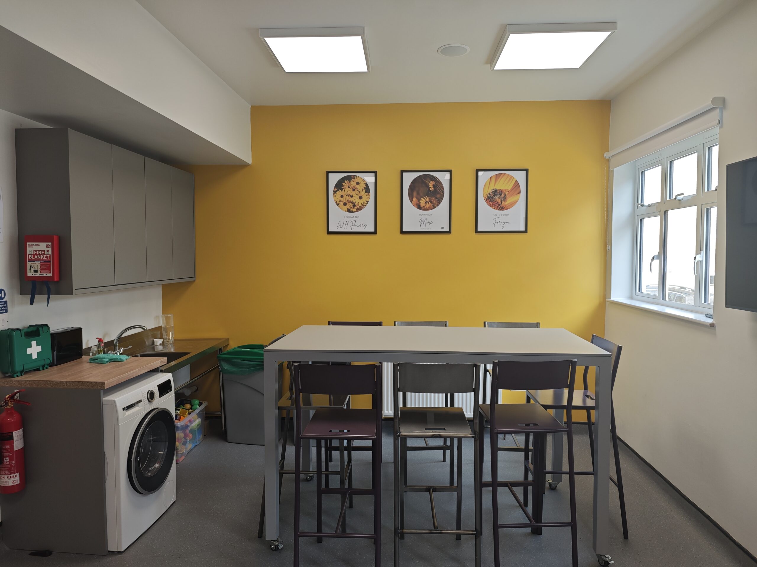 The Sunflower Room has a maximum capacity of 15 (depending on set-up). It includes a state of the art bluetooth sound system, and large presentation display. There is also a sink for cleaning/washing up and a wipeable floor, and a washer/drier for messier activities.